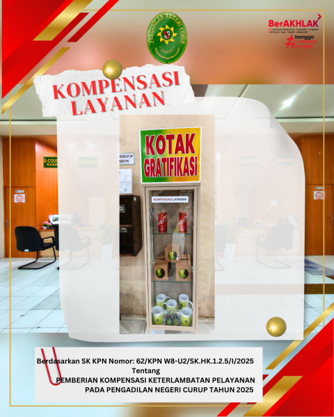 Sebagai tindak lanjut dari telah berlakunya Standar Pelayanan Operasional Prosedur Pelayanan pada Layanan masing-masing bidang, maka Pengadilan Negeri Curup memberlakukan Kompensasi terhadap pengguna layanan yang penyelesaian pelayanannya terhambat, kompensasi ini diberikan kepada pengunjung PTSP yang mendapat layanan lebih dari waktu yang ditentukan, berikut merupakan bentuk kompensasi yang berikan :