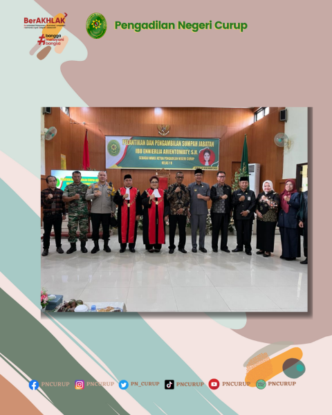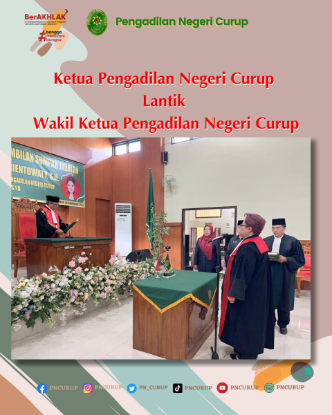 PNCurup; Jum’at (29/12/2023) Pukul 09.00 WIB, bertempat di ruang sidang utama Kusuma Atmadja, telah dilaksanakan Pelantikan Wakil Ketua Pengadilan Negeri Curup berdasarkan Salinan Surat Keputusan Ketua Mahkamah Agung Republik Indonesia Nomor 1796/DJU/SK.KP4.1.3/II/2023 tentang Promosi dan Mutasi Ketua, Wakil Ketua, Hakim Pengadilan Negeri dilingkungan Peradilan Umum. Ketua Pengadilan Negeri Curup melantik Wakil Ketua Pengadilan Negeri Curup Yang Mulia Ibu Ennierlia Arientowaty, S.H. Acara di hadiri oleh Forkopimda Rejang Lebong dan Beberapa Pengadilan Negeri Wilayah Hukum Pengadilan Tinggi Bengkulu. Pelantikan disaksikan oleh Bapak Drs. H. Bahtiar Iman dan Ibu Dra Nurmalis serta Rohaniawan Irsan Sidik, S.Ag., M.H yang turut mengambil sumpah secara keagamaan dan Keluarga Besar Pengadilan Negeri Curup.